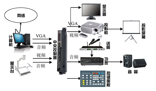 显示系统:投影机、幕布、高清大屏幕、设备吊装。
